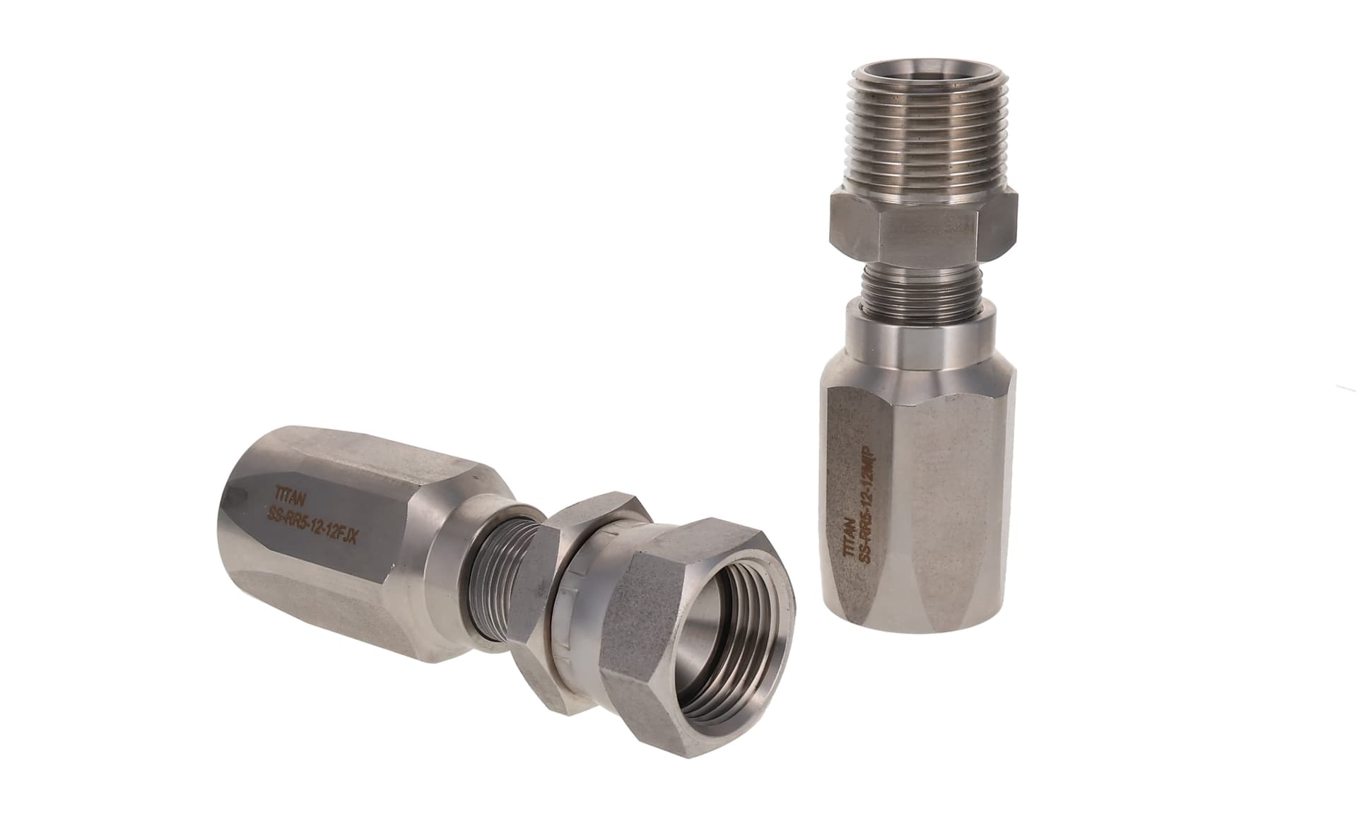 Reusable hose ends are different from regular hydraulic fittings in that they are not permanently attached to the hydraulic hose. Reusable (or Field Attachable) fittings do not require crimping to attach to hydraulic hose. A collar is placed over the hose end, and then a stem is threaded into the collar, creating a seal. The fittings can be tightened by hand or with hand tools. When you'd like to replace the hose or move the fitting to another hydraulic assembly, simply unscrew the collar from the stem.