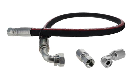 The 3/8" 2 Wire Steel Braid hydraulic hose assembly is designed with a straight ORFS hose end on one side and a 90-degree ORFS hose end on the other, providing a sturdy and reliable solution for hydraulic systems. Featuring a robust two-wire steel braid inner core, this assembly ensures dependable performance. Its MSHA-certified outer cover enhances resistance to abrasion and shields against ozone and various weather conditions, ensuring longevity in diverse environments. The dual hose ends ensure secure and reliable connections, making this hose assembly highly suitable for a wide range of hydraulic applications.