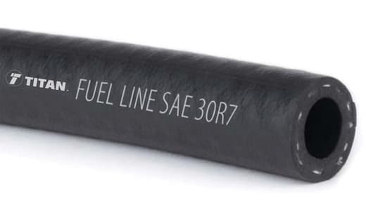 The 30R7 Fuel Line Hose designed for low-pressure fuel applications features an inner core made of Class A nitrile tube and is reinforced with a single textile braid. Offers a wide temperature range from -40°F/-40°C to 257°F/125°C. The hose operates within a pressure range of 175 PSIG to 250 PSIG, varying by size, and is available in diameters from 3/16" to 1/2". Please note that reel lengths are not continuous.
