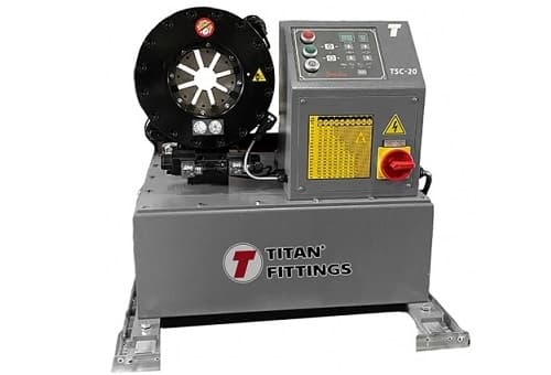 Capable of crimping hoses up to 1 1/4" in diameter, with a crimping range spanning from 4mm to 87mm and a force of 1700 kN. Sized at 24in x 24in x 24in, it includes standard dies in sizes 14mm, 16mm, 19mm, 22mm, 26mm, 30mm, 39mm, and 45mm.