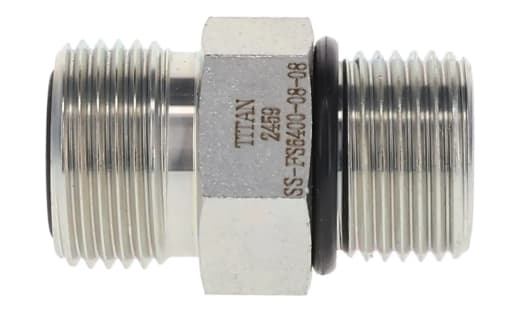 O-Ring Face Seal (ORFS) Adapters are stainless steel. Adhering to SAE J5143 standards, these adapters feature straight threads and an O-ring, ensuring a tight seal between male and female connections. Fittings can also adapt to various other thread types, including JIC, NPT, and NPSM.